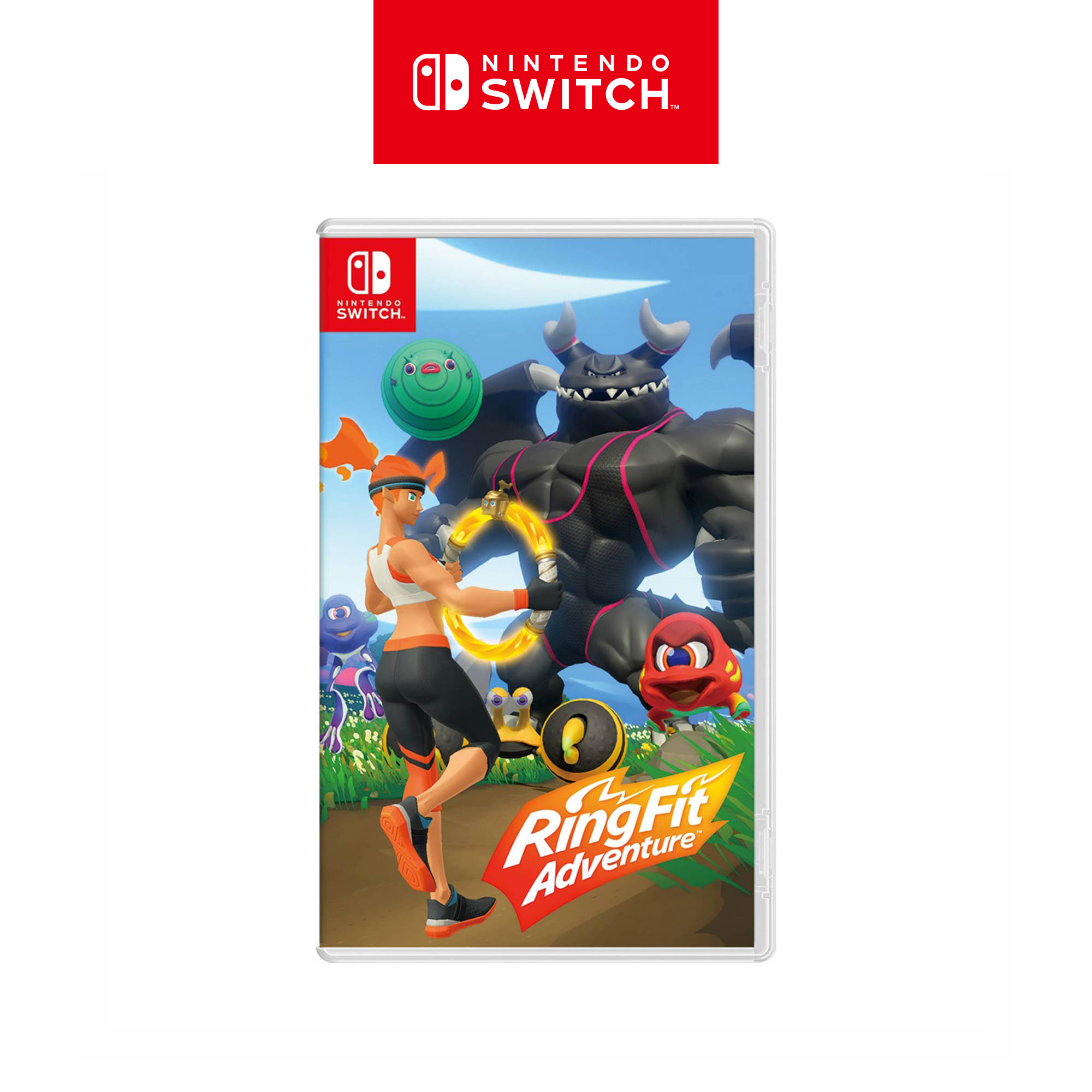 Traverse grass-swept plains by jogging in place, attack enemies with overhead shoulder presses, and refill your health meter by striking some yoga poses. Two new accessories, the Ring-Con™ and Leg Strap, measure your real-world actions and help turn them into in-game movements. With additional minigames and customizable workout routines, Ring Fit Adventure is great escape for players of all skill levels and schedules.In Adventure mode, defeat enemies with attacks based on real-world exercises as you traverse more than 100 levels in over 20 worlds. As you work through each level (and possibly work up a sweat), you’ll earn experience points. Between fights, you may encounter some unusual methods of transportation such as squat-powered launch pads. Then, pass around the Ring-Con and leg strap accessories and select from a few minigames: break boxes with gusts of air, craft pottery using squats, and more.