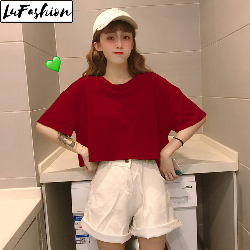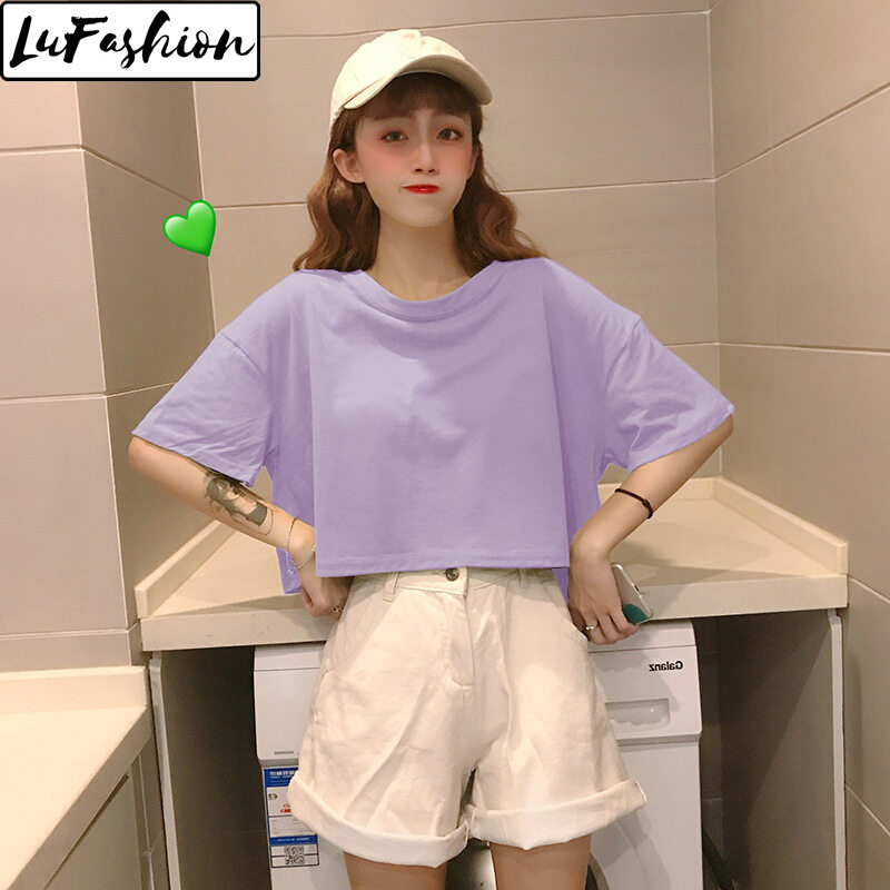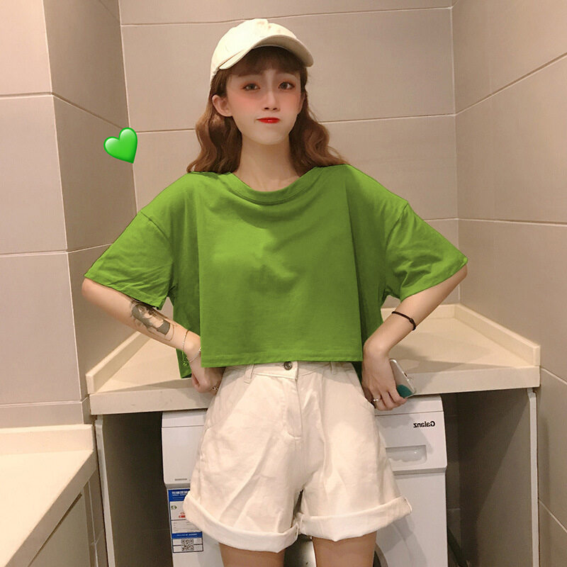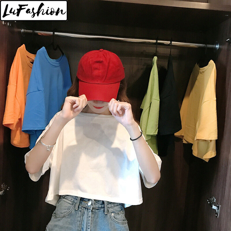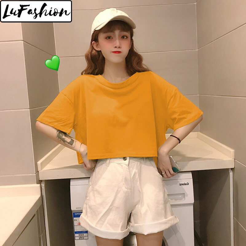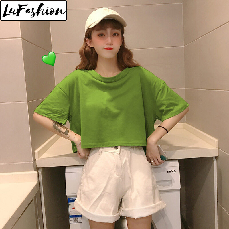LuFashion Crop Tops for Women Summer Candy Colors Short Sleeve Plain Casual T-Shirts
