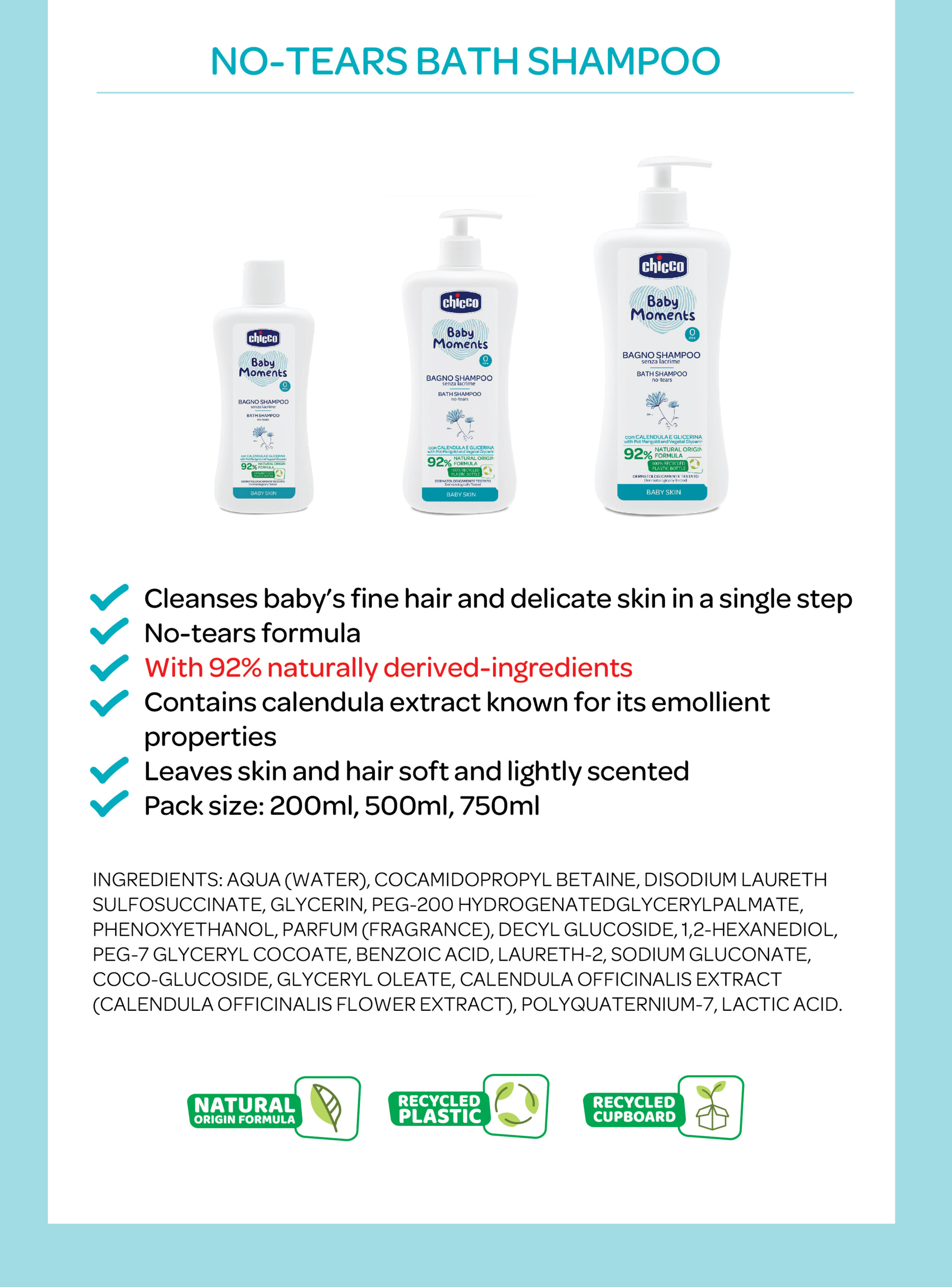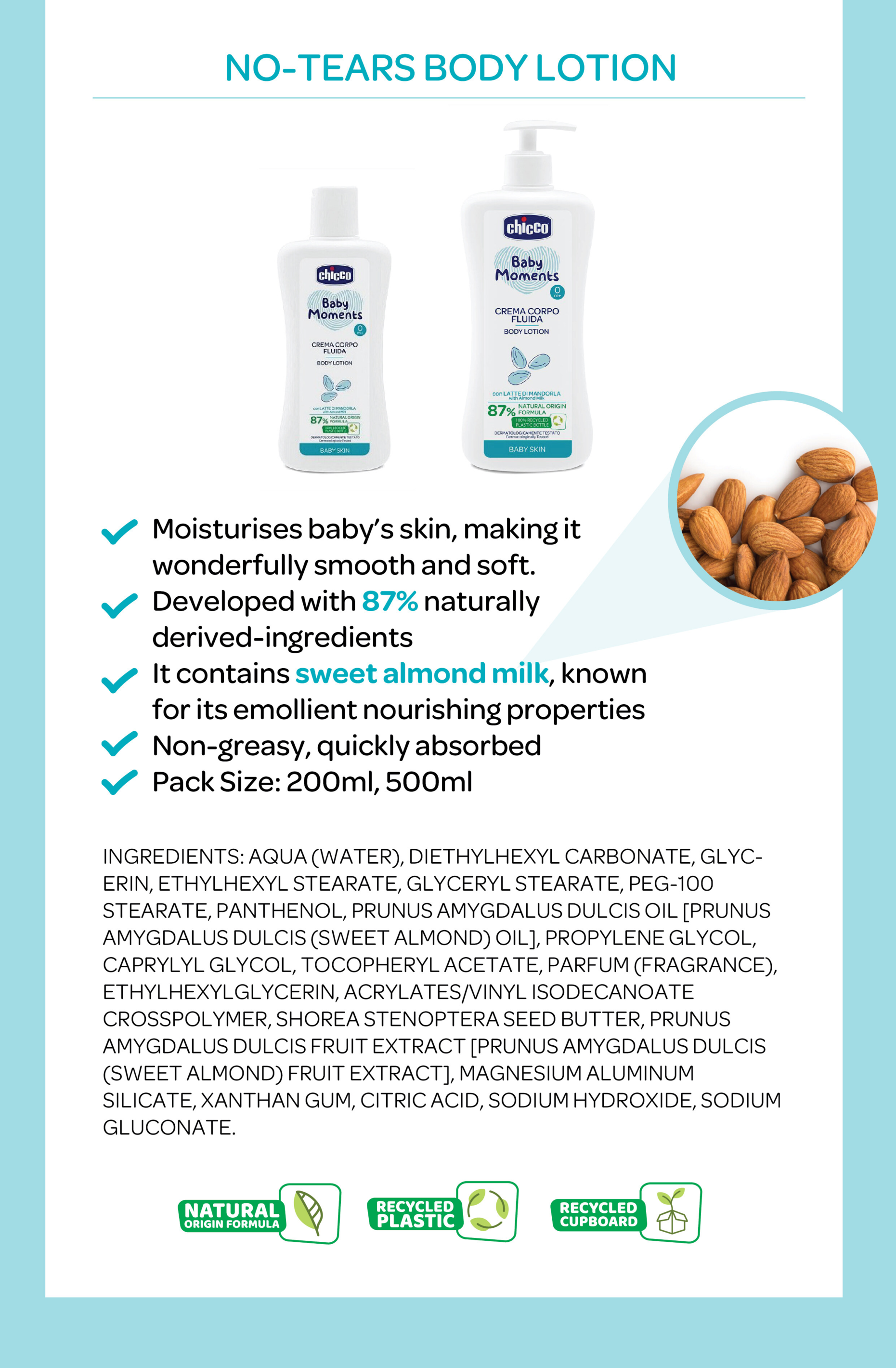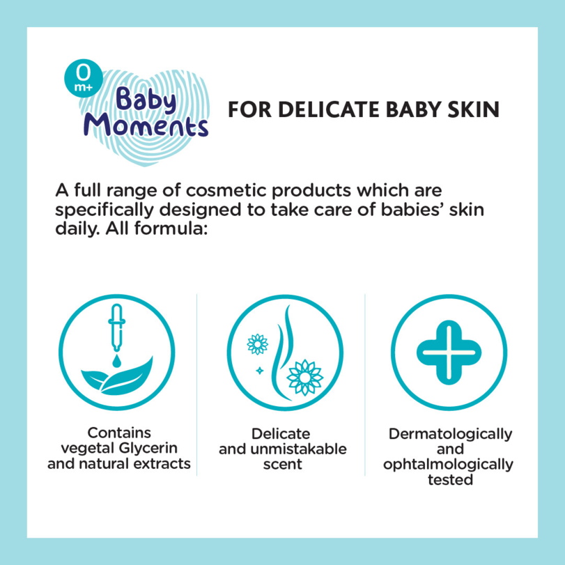 • Moisturises baby’s skin, making it wonderfully smooth and soft