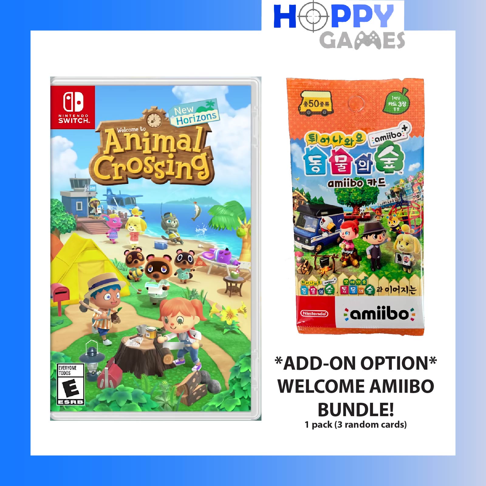 Please choose Game+Amiibo option if u wish to get the Animal Crossing and Welcome Leaf Amiibo Series cards. Amiibo cards come in Korean packaging, with Korean words. Amiibo can still be used normally inside the game and does not affect the language of your gameplay. 1 pack contains 3 Amiibo cards (random design). Total of 50 designs. All cards are packed inside card and unable to choose designs. Refer to designs on https://animal-crossing.com/amiibo/collections/new-leaf-amiibo-cards/