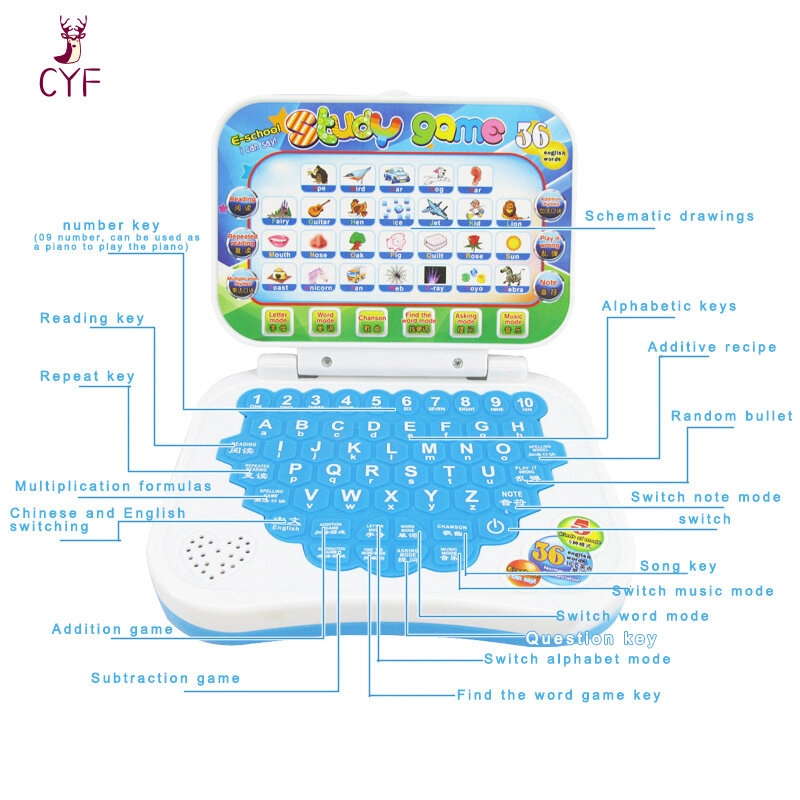 Features: 1.Press the key to start learning. If you press the key after pressing the key, the learning machine will automatically shut down. If you need to use it, you need to press the key again. 2.It has 26 English alphabet keys and 10 numeric keys. Chinese, English learning, can be used as the keyboard of the keyboard, playing music. 3.There are 26 English alphabet keyboards, which correspond to 32 English words and picture knowledge points on the flip cover. When the machine questions, 26 letters are controlled to answer the questions, and after switching, it becomes 26 songs. 4.Fruit and animal prints, click to read in English and Chinese. (Color Random) 5.Chinese mode, English mode, music mode, singing mode, alphabet mode, word mode, spelling mode, and question mode are available for selection.Specification:Item Name: Learning MachineSize: 12x15.5cmFunction: Chinese&English Learning, Preschool educationSuit for: 3+ years older kidColor: RandomPowered By: 3x AA battery(Not Included)Included: 1x laptop
